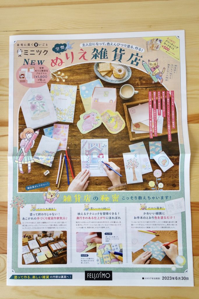 株式会社フェリシモ様のミニツク『猫店長がカラフルな世界にご案内 色えんぴつで雑貨を作る 空想ぬりえ雑貨店プログラム』のぬりえテクニック監修・一部イラストを担当いたしました。